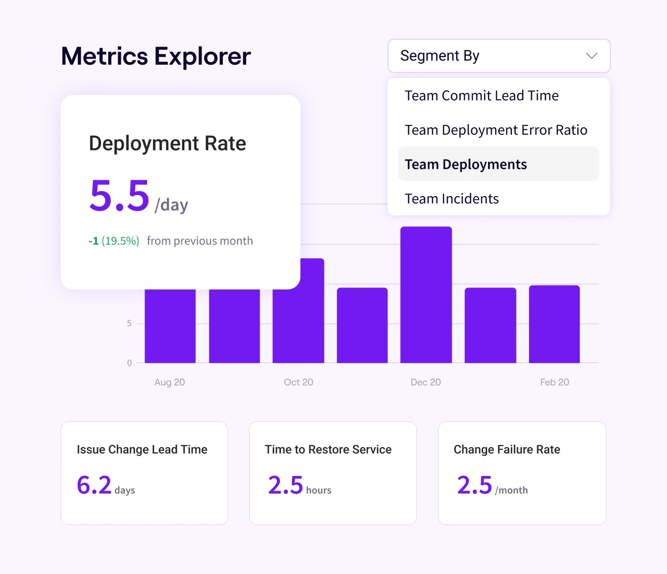 Explore DORA, flow, and custom metrics with filters, overlays, and time-series diagnostics across teams, repos, and services.