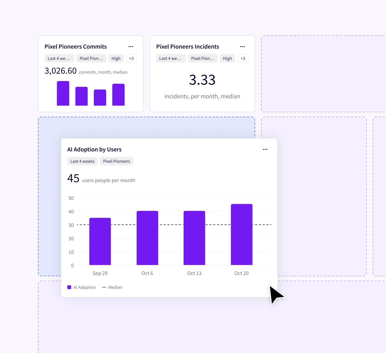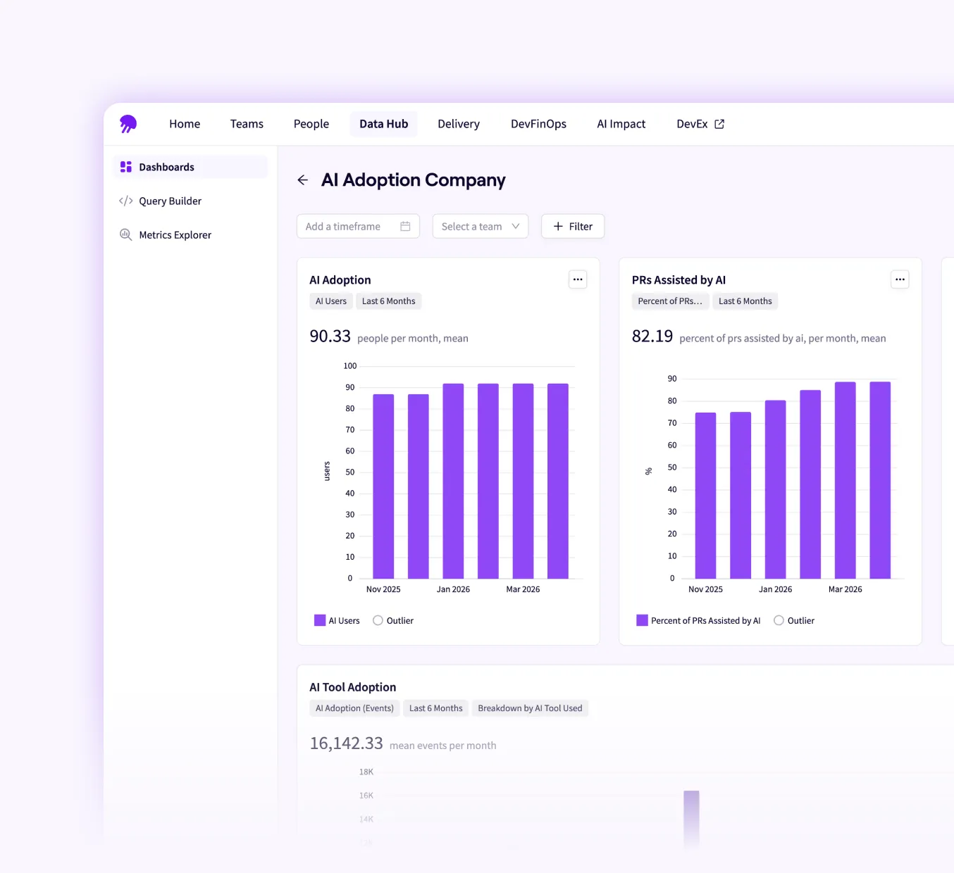 Connect every signal across your engineering systems to surface deeper insights faster. Data Hub gives you powerful ways to combine AI impact, DORA metrics and more with flexible customization options.